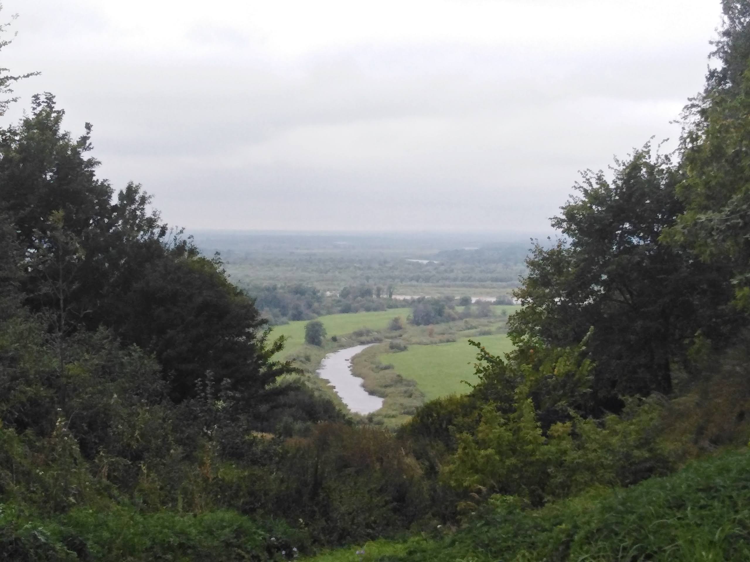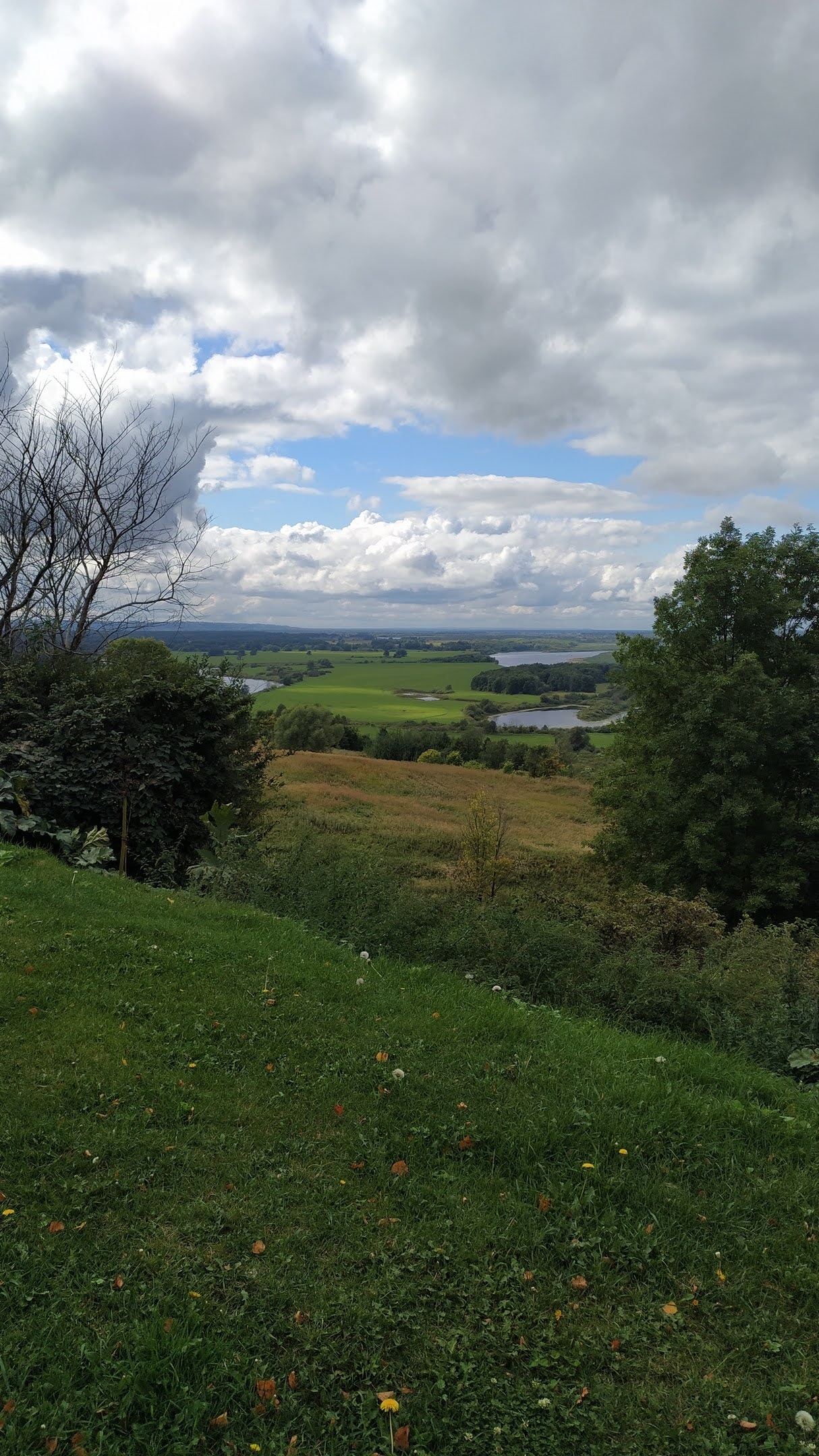 Наша прогулка чуть удлинилась, но зато посмотрели на усадьбу снизу. Точнее увидели высокий-высокий берег обросший лесом, а где-то там наверху усадьба (перепад высоты 70м, как минимум вдвое больше, чем на холме в Ичалковском лесу). Было приятно идти по грунтовой дороге, смотреть на луга.